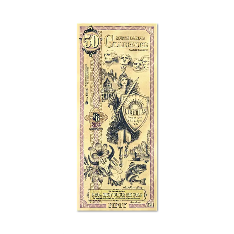 The 50 South Dakota Goldback showcases stunning, historically inspired artwork, celebrating the values, culture, and history of South Dakota. Each meticulously designed note symbolizes themes of freedom, resilience, and prosperity, making it not only a practical financial asset but also a work of art worth collecting.